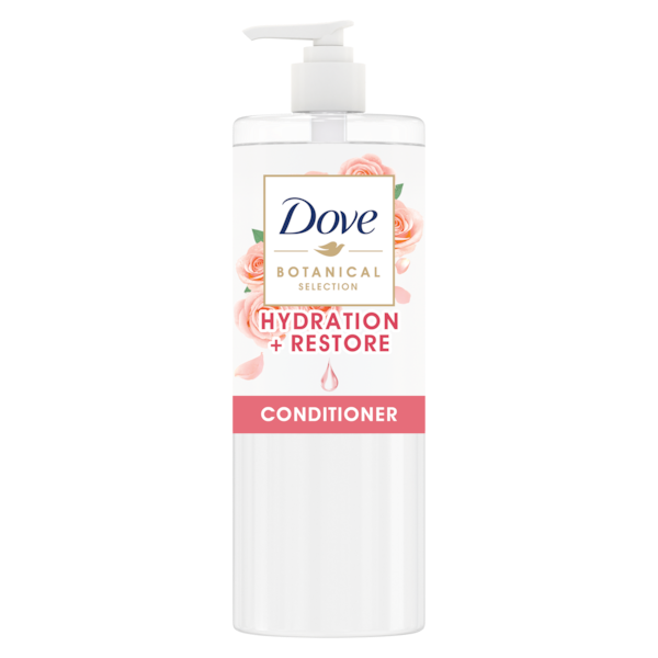 Dove Botanical Selection Hydration + Restore Conditioner with 100% botanical oil and Pink Moroccan Rose extract nourishes dry and damaged hair, leaving hair irresistibly soft and lightweight.
